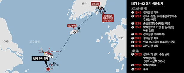 주간조선이 단독으로 입수한 해경 상황일지에 따르면, 사고 헬기가 처음 김해공항을 이륙한 것은 4월 7일 오후 6시45분이었다. 이 헬기는 부산에 있는 중앙해양특수구조단에 오후 6시54분 도착했다. 이곳에서 구조단 소속 잠수사 6명을 태우고 오후 7시3분 다시 이륙했다. 헬기는 3012함으로 가던 중 오후 7시42분에 김해공항 복귀 명령을 받고 오후 8시40분에 다시 김해공항에 착륙했다. 헬기는 오후 9시5분에 다시 김해공항을 이륙해 약 한 시간 뒤인 오후 10시18분에 제주공항에 착륙했고, 연료를 채운 뒤 오후 11시9분 제주공항을 떠나 다음날 오전 12시53분 3012함에 착함했다. 그리고 구조대원들을 내려준 뒤 오전 1시30분에 이륙하다가 2분 정도 후 바로 사고가 났다.