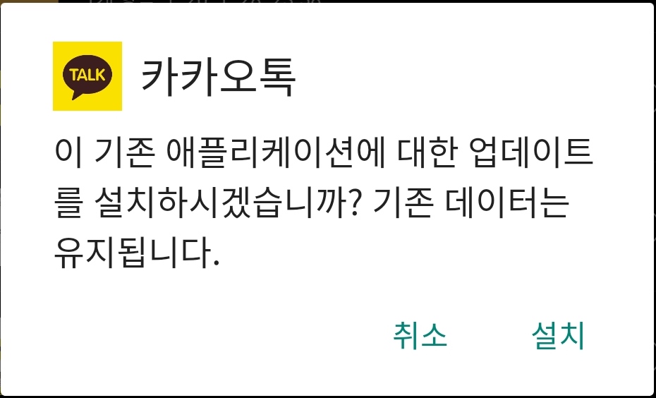 저 apk를 클릭하면 아래와 같은 알림창이 뜬다. 최초에는 이렇게 했었던 것이다. 그러니 구글하고 카카오톡하고 싸우게 두고, 우리는 업데이트 해서 사용하자는 것이다.