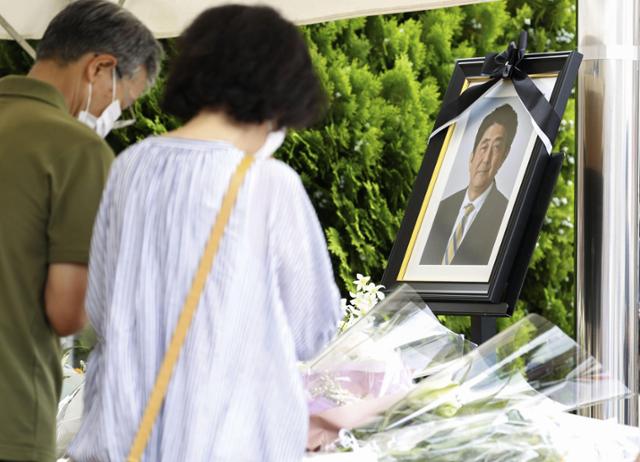 아베 신조 전 일본 총리가 총격을 당한 일본 나라현 나라시 야마토사이다이지역 앞 교차로 근처에 마련된 헌화대에서 10일 시민들이 합장하며 고인을 추모하고 있다. 나라 교도=연합뉴스
