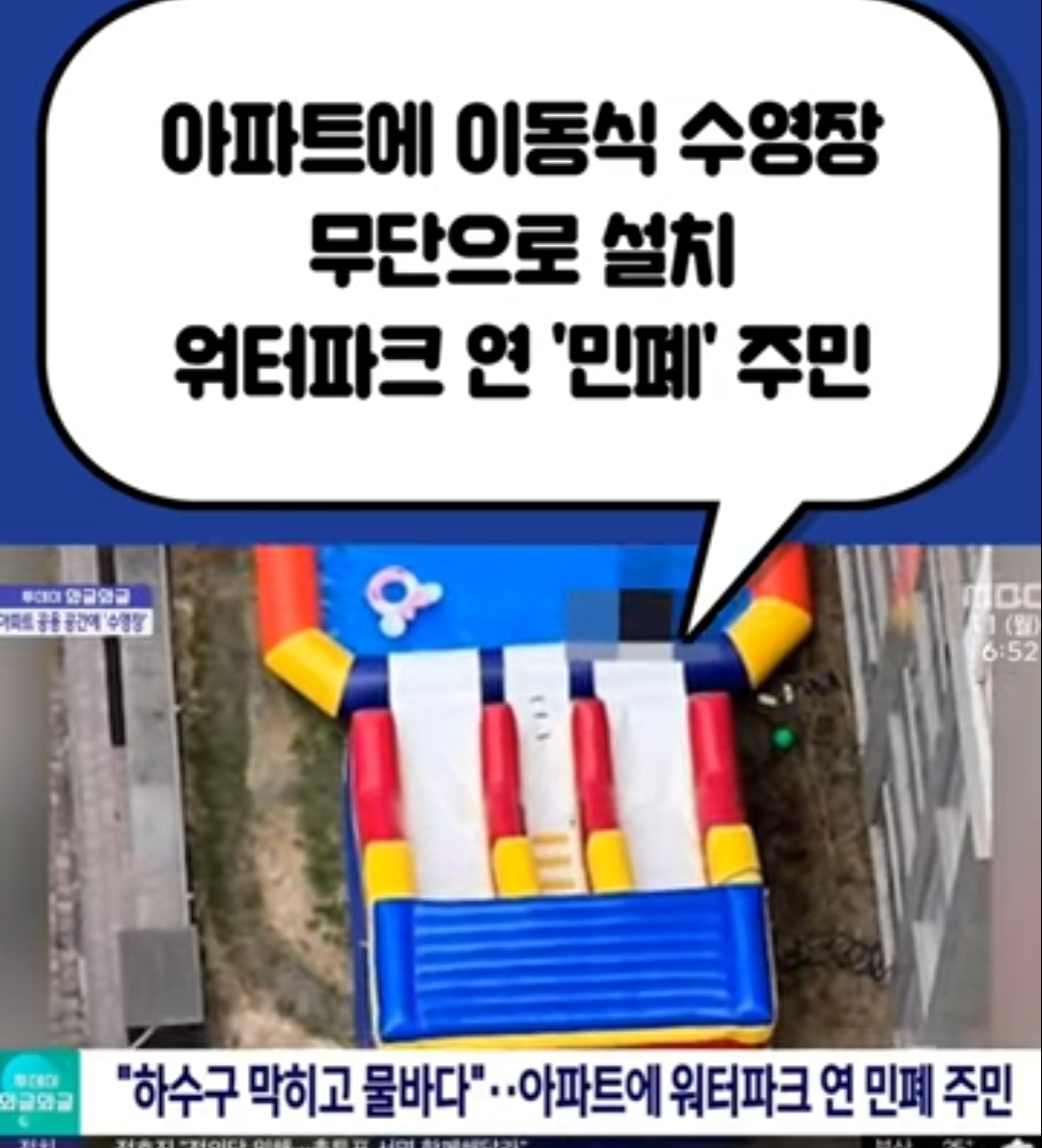 아파트에 워터파크 연 '민폐' 주민 하수구 막히고 물바다 경기도 동탄 아파트 공용공간 입주민 이동식 수영장 무단 설치 공분 아파트 규정상 공용 공간 개인적인 사유로 쓰는 것은 금지
