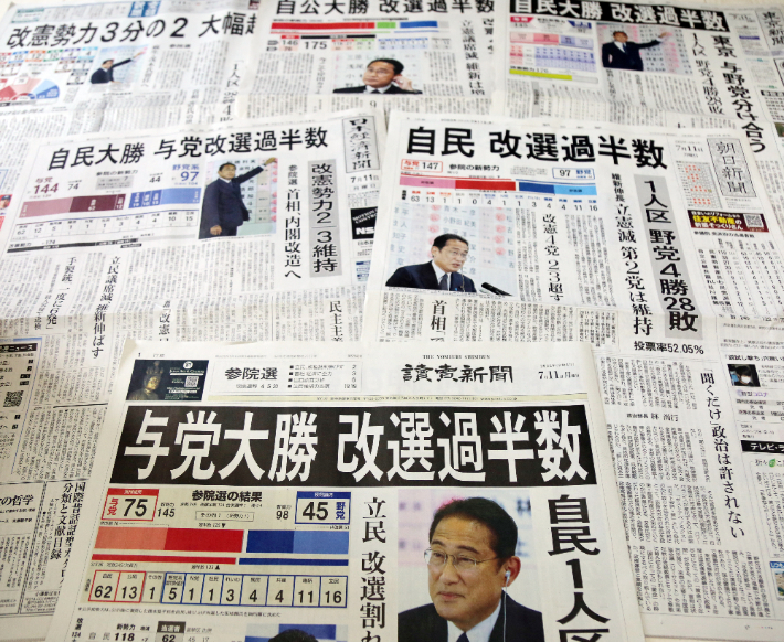 10일 실시된 일본 참의원 선거에서 집권 자민당과 연립 여당인 공명당이 전체 의석의 과반을 차지하며 승리했다는 소식이 11일 도쿄에서 배달된 주요 일간지 1면에 실려 있다. 연합뉴스