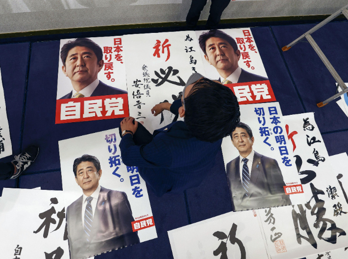 일본 참의원 선거 투표일인 지난 10일 일본 야마구치현 야마구치시에 있는 에지마 기요시 자민당 후보의 진영에서 관계자가 작업 중인 가운데 아베 신조 전 일본 총리의 사진이 담긴 자민당 홍보물이 놓여 있다. 연합뉴스