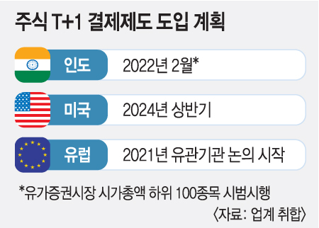 영업 관행과 노하우가 T+2에 맞춰져 있는 기관투자자의 반발도 적지 않을 것으로 보인다. 다른 나라가 T+2를 도입하지 않은 상황에서 우리만 먼저 도입하면 외국인 투자에 부정적 영향을 미칠 수 있다는 시각도 있다. 다른 증권사 관계자는 “우리만 결제를 하루로 줄이면 하루의 시차가 생겨 국제 거래가 복잡해질 것”이라고 했다.
