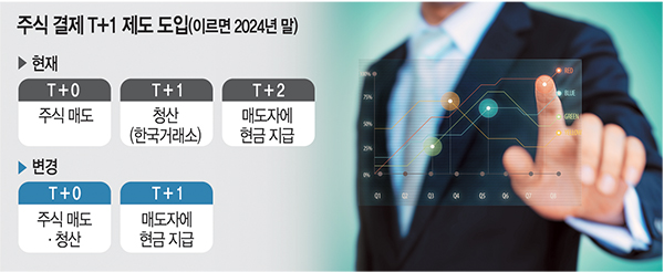 한국거래소가 주식을 매도한 뒤 바로 다음 영업일에 대금을 정산받는 ‘T+1’ 제도를 이르면 2024년 말 도입한다. 현재 이틀인 결제 기간을 하루로 줄여 거래 효율성을 높이고 반대매매 등으로부터 투자자 보호를 강화한다는 취지다. 개인 투자자들은 크게 환영할 것으로 예상되지만 증권사들은 시스템 개편이 필요한 일이어서 난감해 하고 있다.