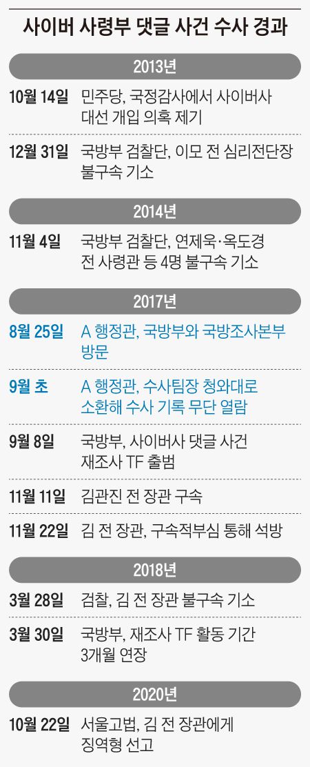 국방부는 그해 9월 8일 ‘사이버사 댓글 사건 재조사 TF(태스크포스)’를 만들었다. 그 무렵 민주당은 “김관진 전 장관 등 군 수뇌부가 댓글 공작에 개입했다”는 의혹을 제기했다. 군 관계자는 “수사팀이 청와대로 불려간 이후 사이버사 댓글 의혹에 관한 군과 민간 검찰의 대대적 재수사가 진행된 것으로 안다”고 했다.