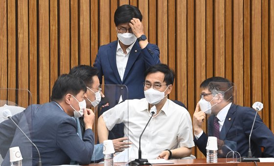국민의힘 초선의원들이 마이크가 켜진 줄 모르고 이준석 대표의 징계와 관련해 논의하는 장면이 방송사 카메라에 포착됐다.