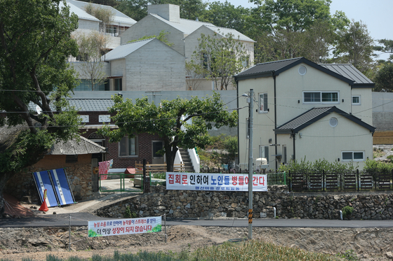지난달 25일 경남 양산시 하북면 지산리 평산마을 문재인 전 대통령 사저 앞에 문 전 대통령 반대단체 집회, 1인 시위에 항의하는 마을주민 현수막이 내걸려 있다. 〈사진=연합뉴스〉