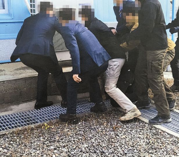 양팔 들린채 北으로 질질 - 정부 관계자들이 몸부림치는 귀순 어민들의 겨드랑이 밑으로 팔을 끼워서 제압하는 장면도 포착됐다. 12일 통일부는 당시 강제 북송 장면이 담긴 사진 10장을 공개했다. /통일부