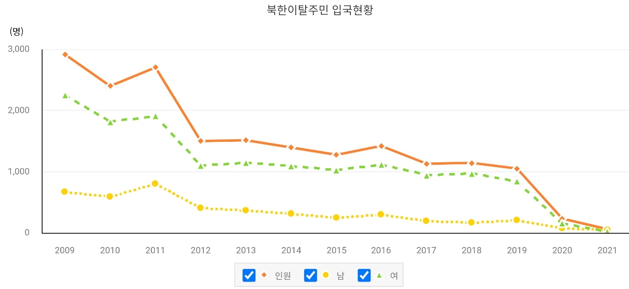 그런데, 2019년 판문점에서 탈북 귀순 어민을 잡아서 강제 북송을 시켰으니, 2019년도에 1천명대였지만 문재인 전 대통령이 김정은과 만나면서, 게다가 강제 북송을 하면서 200명 초반대로 줄어들었고 2021년도에는 무려 63명이다. 이런 상황을 보면 어떤 나비효과가 있었나를 알 수 있지 않나?