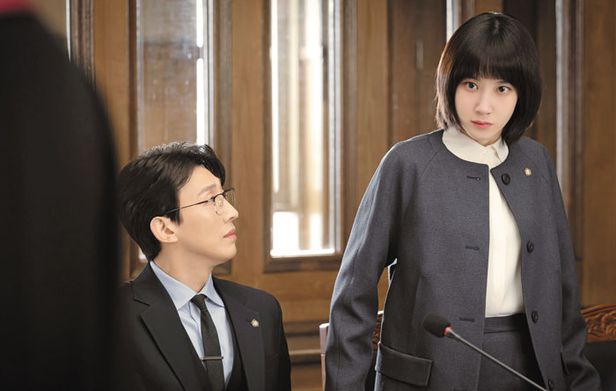 법무법인 한바다의 시니어 변호사 정명석 역할을 맡은 강기영(왼쪽)과 신입 우영우 역의 박은빈. /에이스토리·KT스튜디오지니·낭만크루