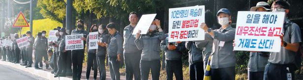 경남 거제 대우조선해양 옥포조선소 1독(dock·배를 만드는 작업장)을 불법 점거한 민주노총 금속노조 소속 거제·통영·고성 조선하청지회(이하 하청지회)의 파업이 40일 이상 이어지며 피해가 커지자 회사 임직원과 시민들이 거리로 나와 ‘인간띠’를 만들며 파업 중단을 촉구했다. 앞서 지난 11일 대우조선해양 노조가 파업 중단을 요구한 데 이어 지역 주민들까지 파업에 반발하고 있는 것이다.