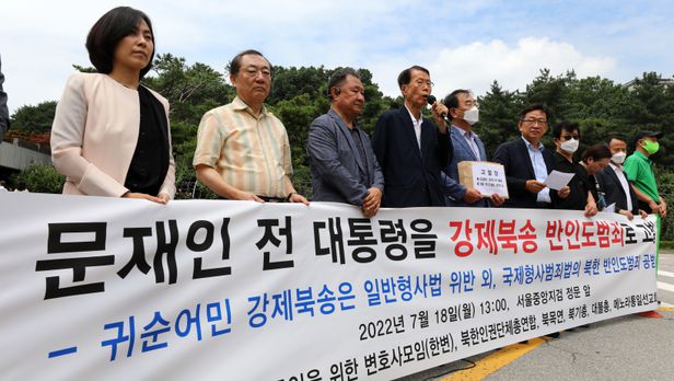 한반도인권과 통일을 위한 변호사모임(한변) 등이 18일 오후 서울 서초구 서울중앙지검 앞에서 탈북어민 강제북송 관련 문재인 전 대통령 고발 기자회견을 하고 있다./뉴시스