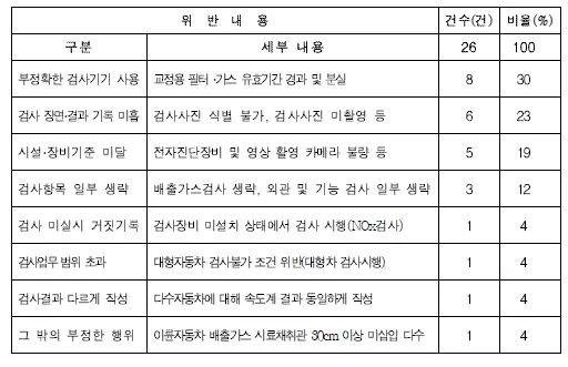 한 검사소는 질소산화물(NOx) 검사장비가 없으면서 검사를 한 것처럼 꾸미고, 대형차 검사를 하면 안 되는데도 실시하다가 적발됐다. 이 검사소는 자동차검사소 지정이 취소되고, 불법행위를 저지른 검사원은 해임될 예정이다.