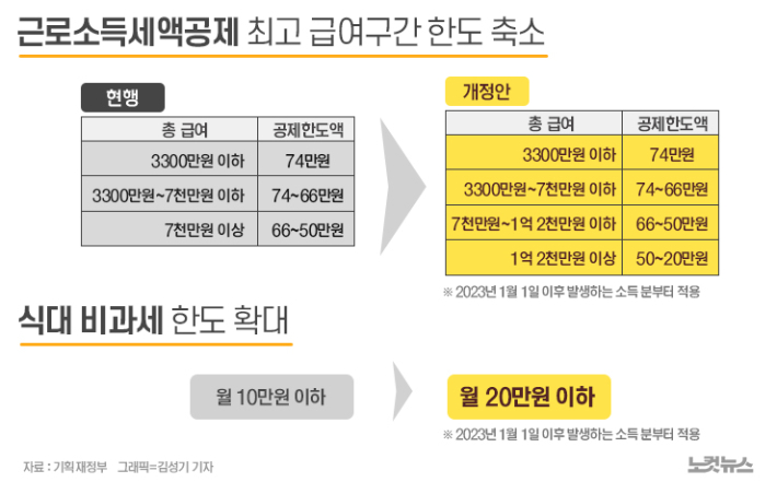 추경호 경제부총리 겸 기재부 장관은 "소득세 과세표준 구간 조정과 식대 비과세 한도 확대로 1인당 최대 80만 원 수준의 소득세 부담이 경감될 것"이라고 강조했다.