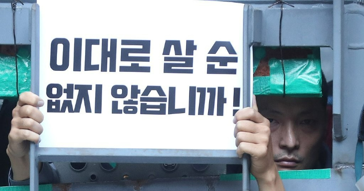 0.3평 철창에 몸 구겨넣은 하청 노동자…"비정규직 삶 그 자체"