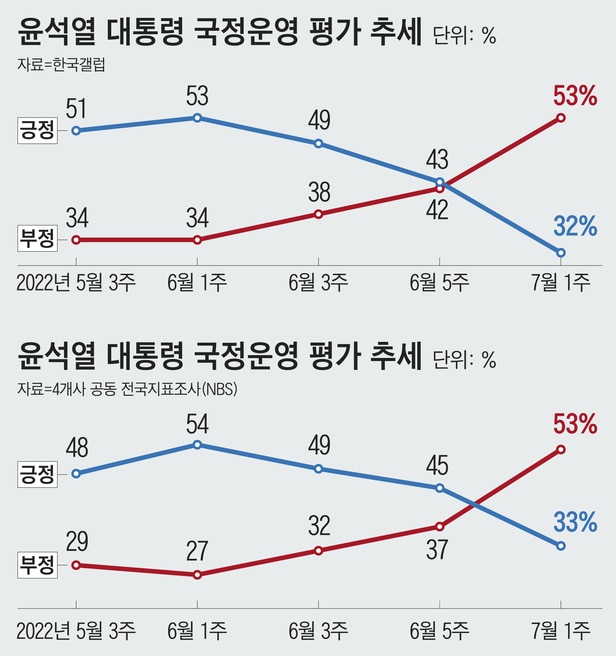 지난 7월 20일 알앤써치가 발표한 조사에서 윤석열 대통령이 국정수행을 ‘잘하고 있다’가 35.6%, ‘잘못하고 있다’는 61.6%였다. 한국사회여론연구소의 7월 18일 발표에선 윤 대통령에 대한 긍정평가가 32%, 부정평가는 63.7%였고, 한국갤럽이 7월 15일 발표한 조사에서도 윤 대통령에 대한 긍정평가가 32%, 부정평가는 53%였다. 지난 7월 14일 엠브레인퍼블릭·케이스탯리서치·코리아리서치·한국리서치 등 4개 조사회사 공동 전국지표조사(NBS)에서도 윤 대통령에 대한 긍정평가가 33%, 부정평가는 53%였다. 각 조사에서 윤 대통령 지지율은 32~35.6%로 30%대 초·중반에 머물렀고 부정평가가 50~60%대였다.