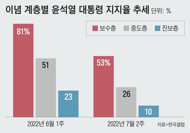 최근 윤 대통령 지지율의 특징은 모든 조사에서 취임 후 최저 수준을 기록했고, 국민 과반수가 부정적으로 평가하고 있다는 점이다. 갤럽 조사에서 윤 대통령 지지율은 6월 첫째 주에 53%였지만 7월 첫째 주에는 32%로 21%포인트나 하락했다. NBS 조사에서도 6월 첫째 주 54%였던 지지율이 7월 첫째 주 33%로 떨어졌다. 윤 대통령의 지지율은 대선 때 그를 지지했던 보수층에서 하락 폭이 가장 컸다. 한국갤럽 조사에서 지난 한 달 사이에 보수층은 지지율이 81%에서 53%로 하락했고, 중도층에서도 51%에서 26%로 반토막났다. 원래부터 지지율이 23%로 낮았던 진보층에선 10%로 떨어졌다.