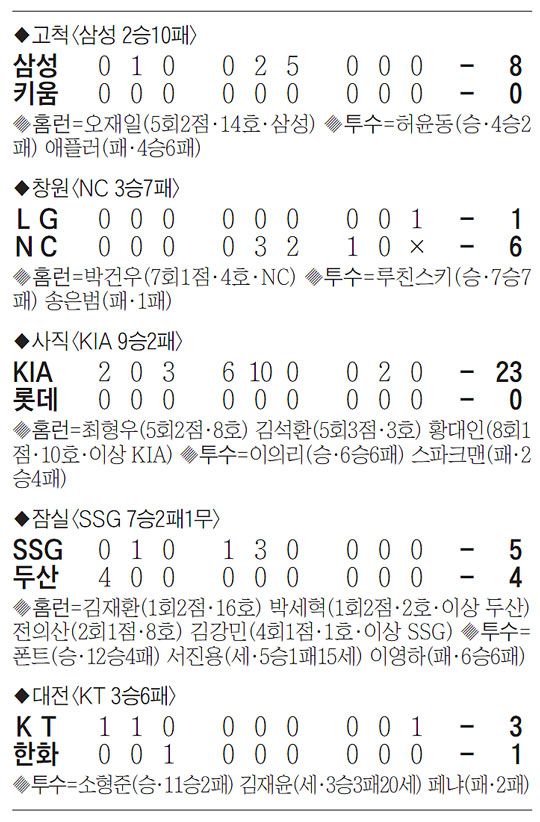 KIA는 사직에서 홈 팀 롯데를 23대0으로 대파했다. 홈런 세 방을 포함해 장단 26안타를 때렸다. KIA는 프로야구 40년 역사상 가장 많은 득점 차이(23점)로 승리를 거뒀다. 종전 기록은 22점으로 2번 있었다. 삼성이 1997년 5월 LG를 27대5로 이겼고, 롯데가 2014년 5월 두산을 23대1로 누른 적이 있다.