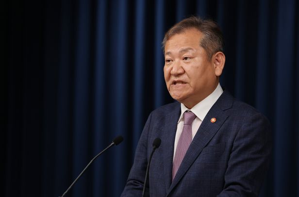 이상민 행정안전부 장관이 26일 오후 서울 용산 대통령실 청사 브리핑룸에서 윤석열 대통령에게 부처 업무보고를 한 뒤 업무보고 내용 등에 대해 브리핑하고 있다. /연합뉴스