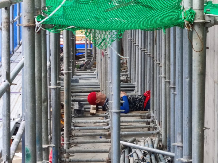 (건설노조 측 제공) 휴게실이 없어 시스템비계 위나 합판을 까는 등 건설 현장에서 잠깐 휴식을 취하는 노동자