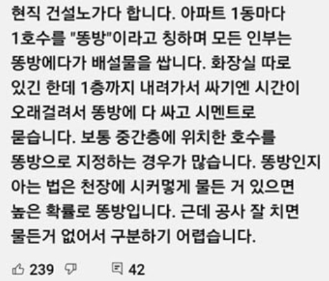 신축 아파트 인분, 전국 다 그래 이유를 아세요? 건설 현장 내 화장실은 보통 1층에만 설치 고층 작업 시 화장실 왕복에 30분이나 소요 특정 호수 지정? 현장마다 달라 심한 케이스