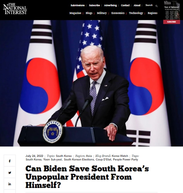 이들이 말한 ‘미 언론’은 안보전문지 내셔널인터레스트. 해당 글은 ‘조 바이든 미국 대통령이 인기 없는 한국의 대통령을 자신으로부터 구할 수 있을까’라는 글이었다.