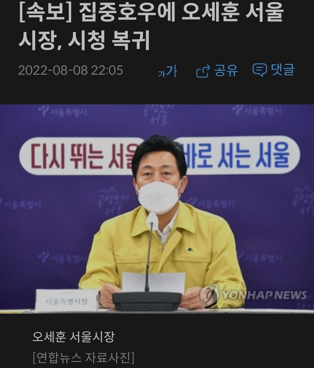 집중포우에 오세훈 서울 시장, 시청 복귀