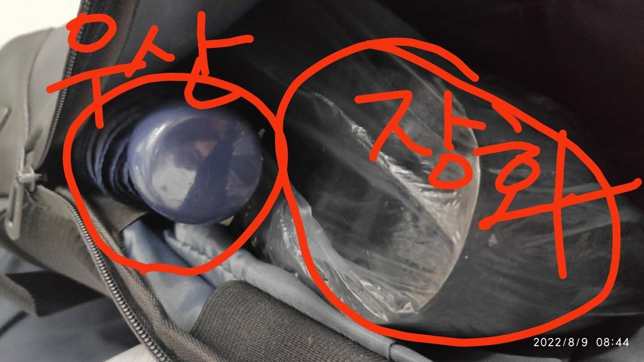 장화를 목이 긴 걸 사지 않고, 짧은 걸 샀다. 그래서 그걸 비닐에 넣어서 가방에 넣었다. 가방은 빵빵해졌다. 작은 사이즈라 이렇게 넣으면 풀 장착이다.