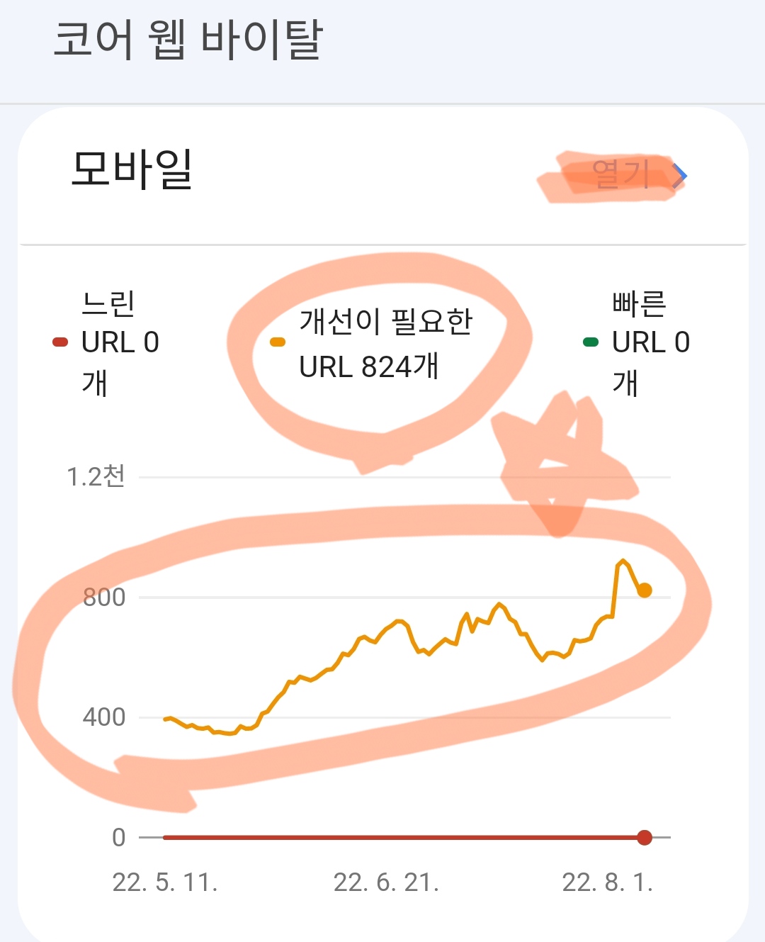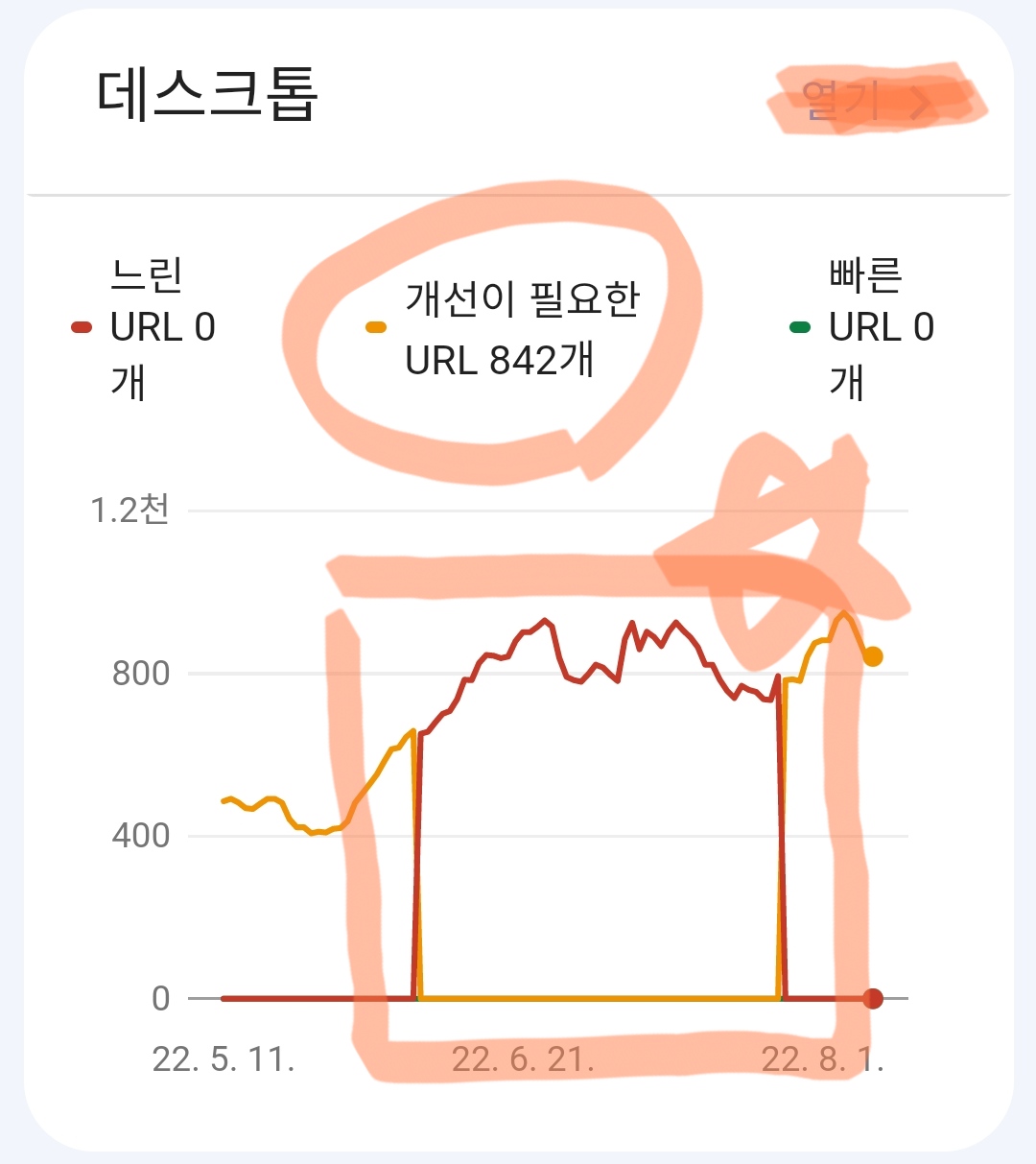코어 웹 바이탈 데스크톱 화면이다. 계속 느린 상태로 빠졌다가, 레벨이 느리지도 빠르지도 않은 중간 상태가 되었다. 최근에서야 개선이 필요한 상태로 바뀌었다.