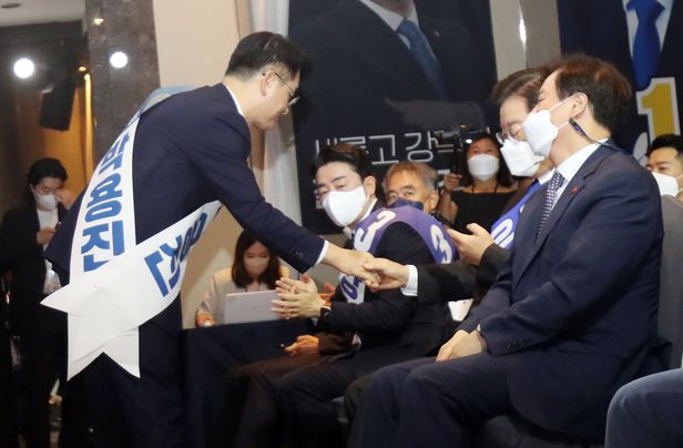 박용진 민주당 당대표 후보가 7일 유세에서 정견 발표를 마치 뒤 이재명 후보와 악수하는 장면./뉴스1