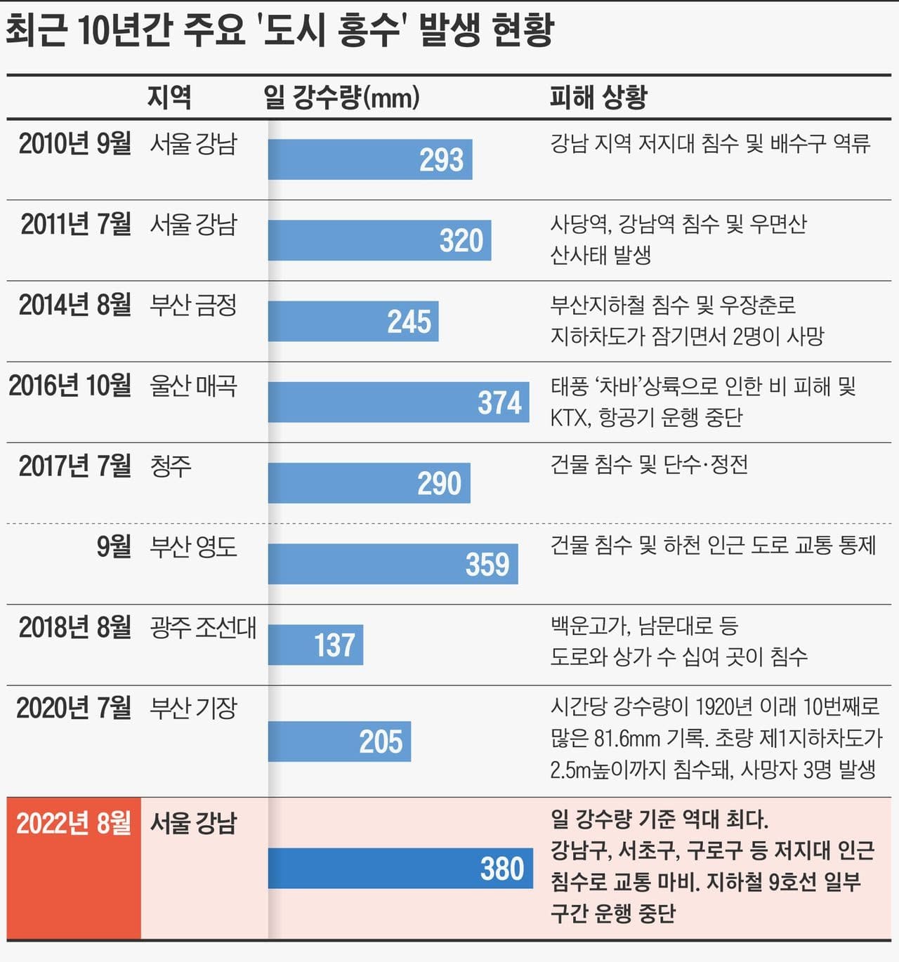 최근 10년간 주요 '도시 홍수' 발생 현황