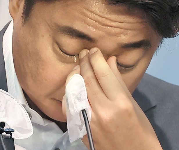 눈물 흘리는 이준석 前대표 - 국민의힘 이준석 전 대표가 13일 국회 소통관에서 기자회견을 하던 도중 눈물을 훔치고 있다. 이 전 대표는 회견 후 질의응답에서 눈물의 의미를 묻는 기자들의 질문에“분노의 의미가 가장 큰 것 같다”고 답했다. /연합뉴스