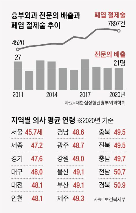 어렵고 복잡한 수술을 하는 기피 과(科)일수록 의사 고령화가 심하다. 대한심장혈관흉부외과학회가 발표한 ‘흉부외과 전문의 배출 현황’을 보면, 현재 진료를 하는 65세 미만 흉부외과 전문의는 1161명, 이 중 60.8%(707명)는 50세 이상이다. 올해 흉부외과에 충원된 전공의는 23명으로 정원의 35%에 그친다. 의사가 일시에 사라져버리는 ‘세대 단절’도 우려된다. 현직 흉부외과 전문의의 28%에 달하는 436명이 10년 내에 정년 퇴직하는데 젊은 의사 충원은 턱없이 부족하기 때문이다.