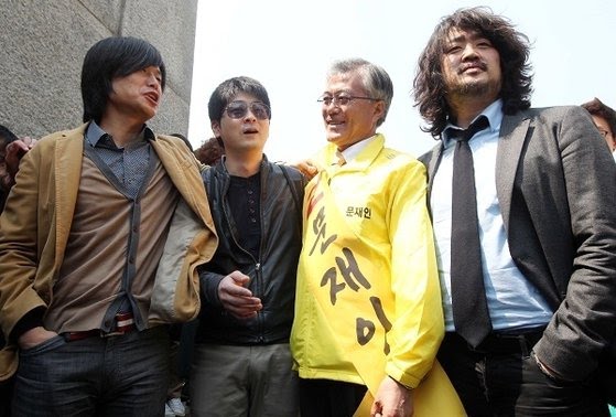 2012년 대선 직전 탁현민씨(왼쪽에서 둘째)가 문재인 당시 대선 후보와 찍은 사진. 탁씨는 김어준씨(맨 오른쪽)가 진행하는 tbs 라디오 프로그램에서 윤석열 정부를 비판했다. [중앙포토]