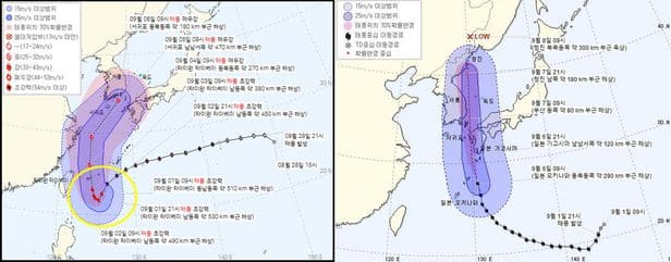 태풍 '힌남노'(왼쪽)와 2020년 태풍 '하이선' 이동 방향을 보면, 힌남노는 대만 부근에서 남진하다가 방향을 틀어 올라오는 모습을 보이고 하이선은 북동진하며 한반도를 향해 올라오는 모습을 보였다./기상청