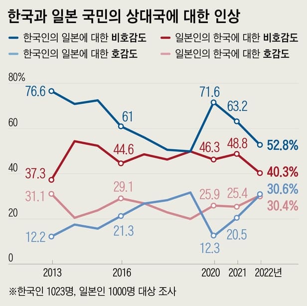 반면 비호감도는 감소했다. 한국인의 일본에 대한 나쁜 인상은 52.8%로 전년 대비 8.6%p 줄었고, 일본인의 한국에 대한 나쁜 인상은 40.3%로 전년 대비 8.3%p 감소했다.
