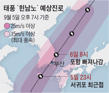 경남 남해안은 오전 6시, 부산 오전 7시, 포항 오전 8시에 태풍 중심권에 들 전망이라 이 시간을 전후해 각별히 태풍 피해에 조심해야 한다. 힌남노는 5일 밤 제주도에 접근하며 진행 속도가 점점 빨라지고 있어 이보다 이른 시간에 한반도를 관통하고 빠져나갈 가능성도 있다. 5일 오전 10시만 해도 시속 24㎞로 나아가던 힌남노는 오후 4시가 되자 가속페달을 밟은 듯 33㎞까지 속도를 높였다.