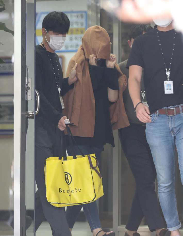 검정색 니트와 청바지 차림에 검정 샌들을 신은 A씨는 황토색 코트로 머리부터 어깨까지 덮어 얼굴을 완전히 가린 상태에서 경찰서를 빠져 나갔다.