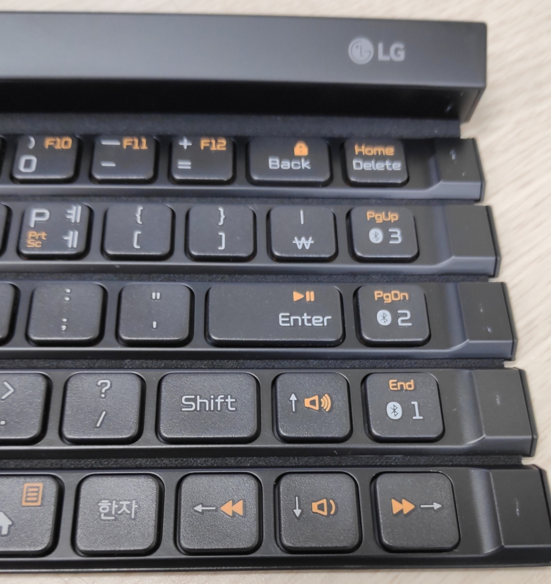 [장점] * 휴대 편리, * 블루투스라 연결 용이, * 말아두면 전원 꺼짐(절전 효과), * 핸드폰 거치대 완벽(두꺼우면 안됨...), * 일반 키보드 기능 대부분 다 됨(PrtSc도 있음) 등등