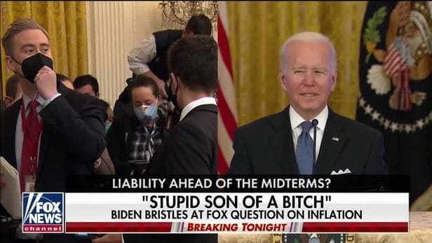조 바이든 미국 대통령이 지난 1월 백악관 기자회견을 마무리하면서 인플레이션에 대해 질문을 던진 폭스뉴스 기자를 향해 혼잣말로 "멍청한 개자식(stupid son of a bitch"이라고 욕설하는 모습이 의회 중계방송을 통해 그대로 중계됐다. /폭스뉴스 캡처