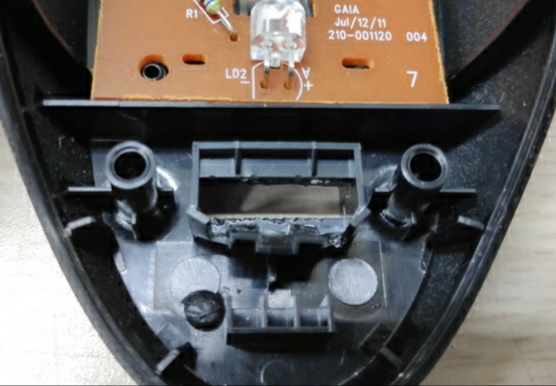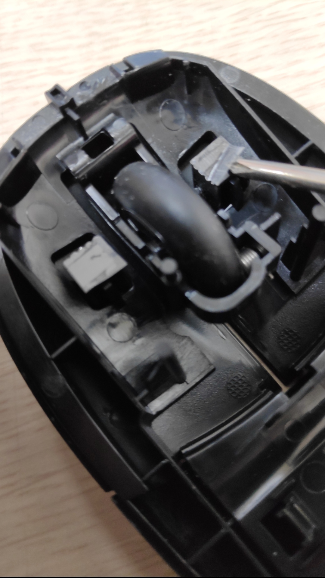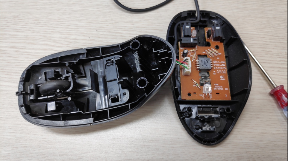 난감했다. 그런데 다른 마우스에서는 보지 못한 직사각형 구멍이 있다. 뭔가 걸쇠가 있는 걸로 봐서 저걸 밀면 열릴 것 같았다. 그런데, 갖고 있는 드라이버는 십자드라이버~