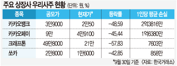 지난해 8월 6일 상장 당시 카카오뱅크 직원들은 전체 물량의 19.5%인 1274만3642주를 우리사주로 매입했다. 1인 평균 1만2500주(약 4억9000만원) 꼴이다. 공모가 3만9000원에 상장한 카카오뱅크는 상장 첫 달 종가 기준 9만2000원까지 주가가 오르며 승승장구했지만 우리사주 보호예수 기간인 1년이 지나지 않은 탓에 처분이 불가능했다. 이후 시장이 급격히 얼어붙으며 카카오뱅크는 추락을 거듭했다. 지난 30일 주가는 2만50원으로 공모가(3만9000원) 대비 48.6% 하락했다. 직원들의 1인당 평균 손실 금액은 2억3800만원에 이른다.