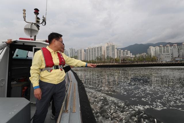 홍남표 창원특례시장이 3일 3·15해양누리공원 앞바다에 떠 있는 폐사한 어린 청어떼를 살펴보고 있다. 창원시 제공