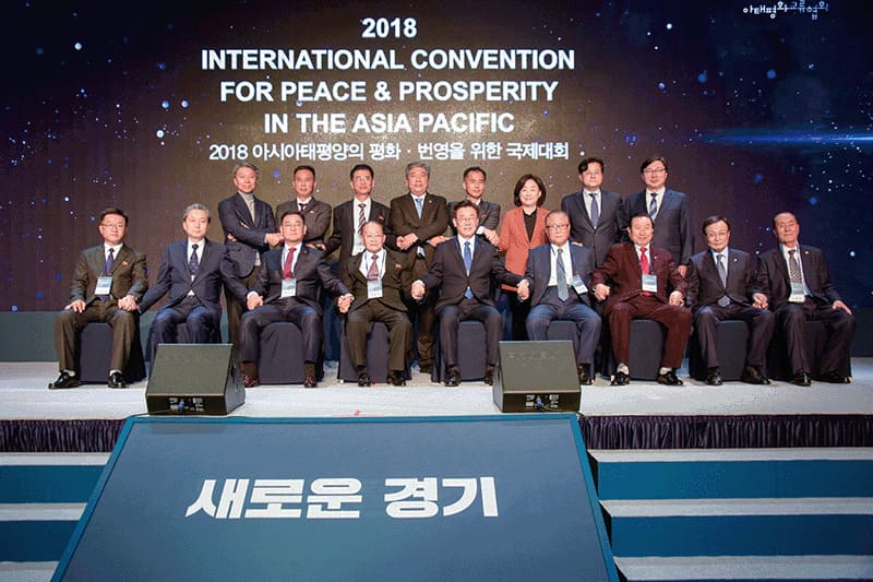 2018년 11월 경기도 고양시에서 경기도와 아태평화교류협회가 공동주최한 ‘아시아 태평양의 평화와 번영을 위한 국제대회’에서 참석자들이 기념촬영을 하고 있다. photo 아태평화교류협회