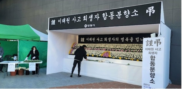 안양시가 마련한 이태원 참사 관련 안양역 분향소. 시는 사망자 분향소 명칭을 희생자 분향소로 변경했다.