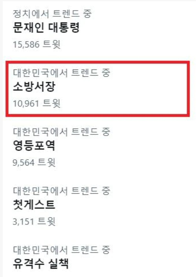 7일 오후 트위터 실시간 트렌드에 '소방서장' 키워드가 올랐다. /트위터
