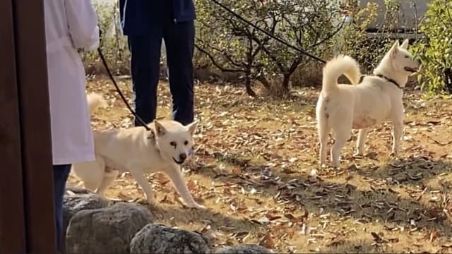 문재인 전 대통령이 파양한 송강이와 곰이가 9일 경북대 수의과대학 부속 동물병원에서 산책하는 모습이 포착됐다. /대구=최훈민 기자