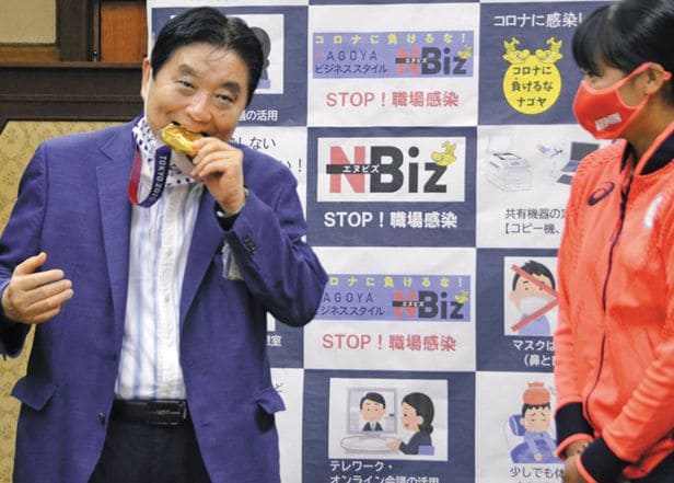 가와무라 다카시(왼쪽) 나고야 시장이 지난 4일 시청을 방문한 도쿄올림픽 소프트볼 우승 멤버 고토 미우의 금메달을 깨물고 있다. /교도 연합뉴스