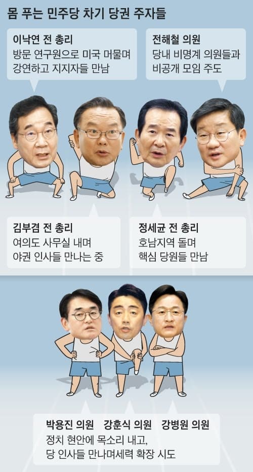 김부겸 전 총리 측도 분주하게 움직이는 분위기다. 김 전 총리는 공개 활동을 하고 있지 않지만 최근 경남 양산을 찾아 문재인 전 대통령과 만났다. 또 ‘드루킹 사건’으로 복역 중인 문 전 대통령의 최측근 김경수 전 경남지사도 면회했다. 청와대 출신들과도 자주 만나는 것으로 전해진다. 김 전 총리 측 인사는 “계파색이 옅은 김 전 총리가 나서야 한다는 의견이 적지 않다”며 “하지만 지금처럼 당내 갈등이 심한 상황에선 나설 때가 아니라는 게 김 전 총리 입장”이라고 했다.