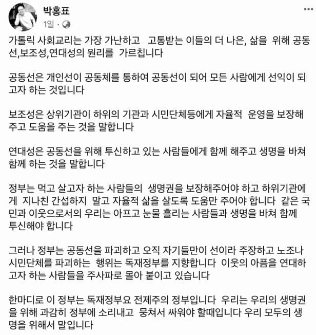 박 신부는 1일 페이스북에 “가톨릭 사회교리는 가장 가난하고 고통받는 이들의 더 나은 삶을 위해 공동선, 보조성, 연대성의 원리를 가르친다”며 “공동선은 개인선이 공동체를 통하여 공동선이 돼 모든 사람에게 선익이 되고자 하는 것”이라고 했다.